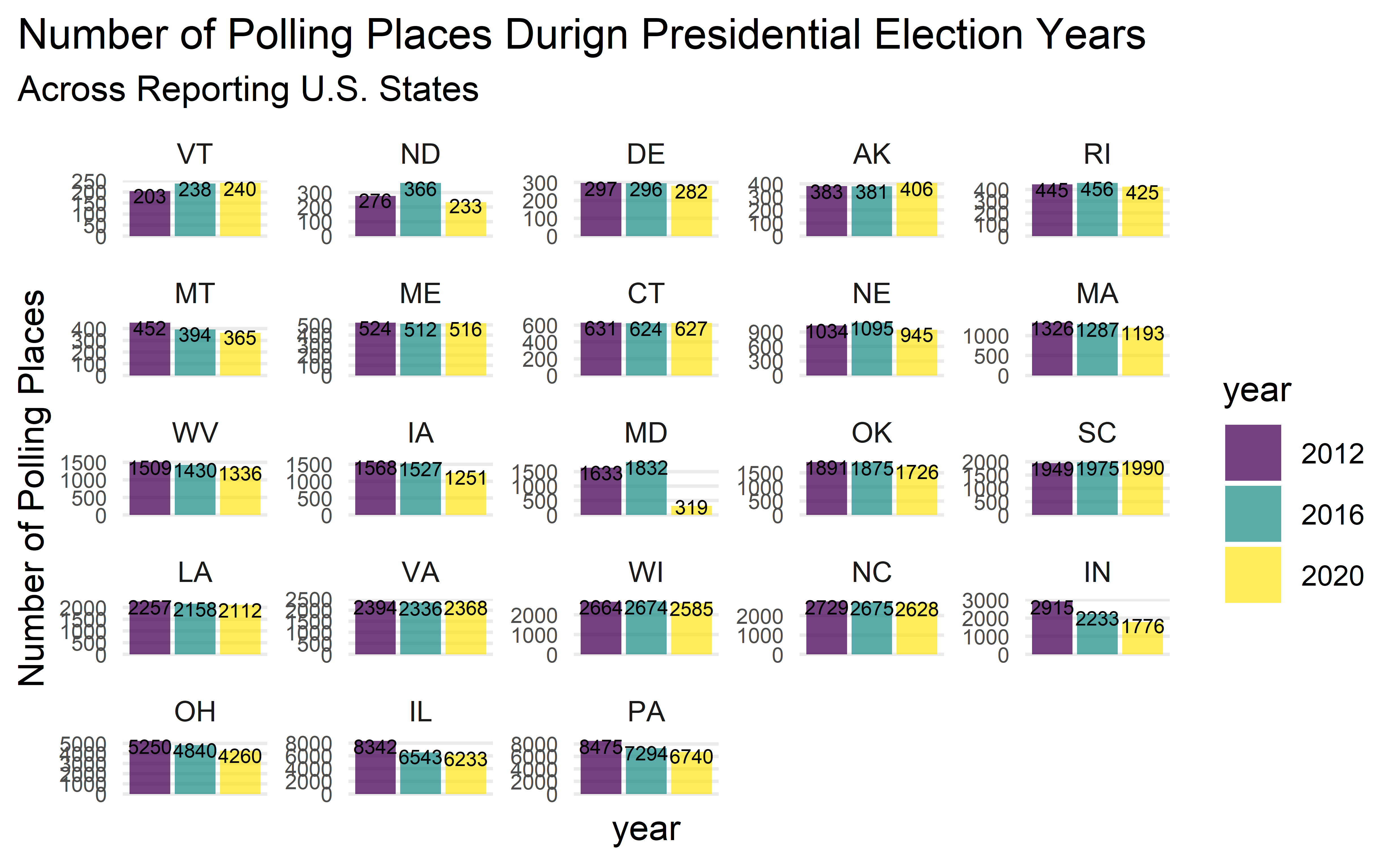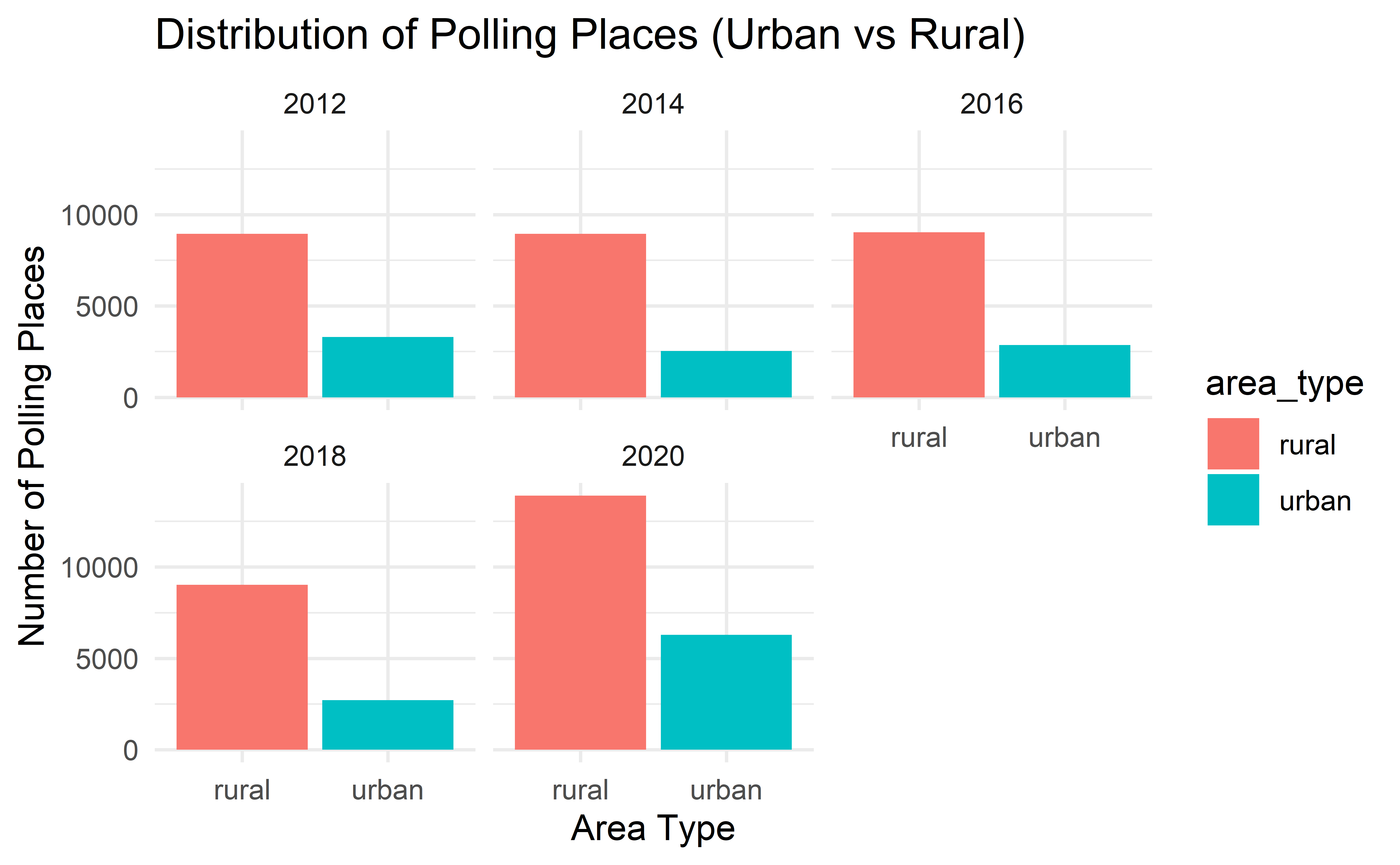 This project aims to analyze the trends in polling place availability across the United States from 2012 to 2020, with a specific focus on temporal changes and geographic disparities. By examining national and state-level data, as well as differences between urban and rural areas, this project seeks to understand the factors influencing polling place changes and their impact on voter accessibility. Through this analysis, we hope to provide insights that can inform policies to enhance voter access and participation in future elections.